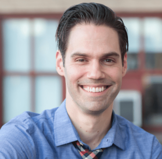 Image Description: A person with short black hair is sitting in a group, smiling as they look down. They have dark brown skin and are wearing a red sweater. On top of the photo are the words “Let’s work together” and a green button that says “Engage.”