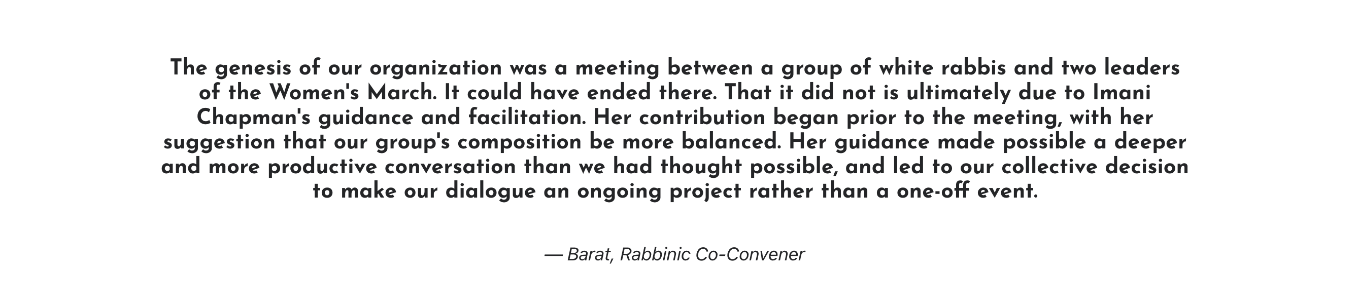 Imani currently serves on the Board for the Roger L. Wallace Excellence in Teaching Award and Jewish Studio Project. Additionally, she was the founding co-chair of the Steering Committee for the New York Metro Coalition of Faith/Spiritual/Ethical Communities for the People’s Institute for Survival and Beyond, and The Race Working Group at Kolot Chayeinu Synagogue.
