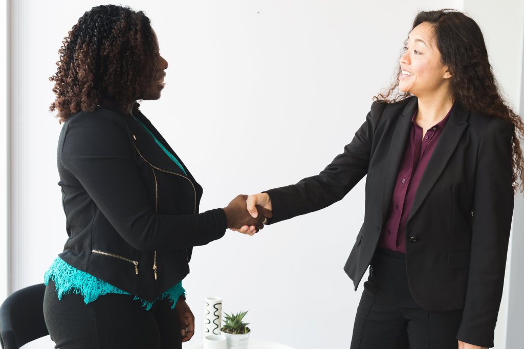Image Description: Two people are seated across a table from each other. The person in focus has brown skin, short dark curly hair, and wears a red long-sleeve shirt. They hold a clipboard and gesture with their hands while talking. On top of the image are the words “Ready for transformation?” and a green button that says “Connect.”