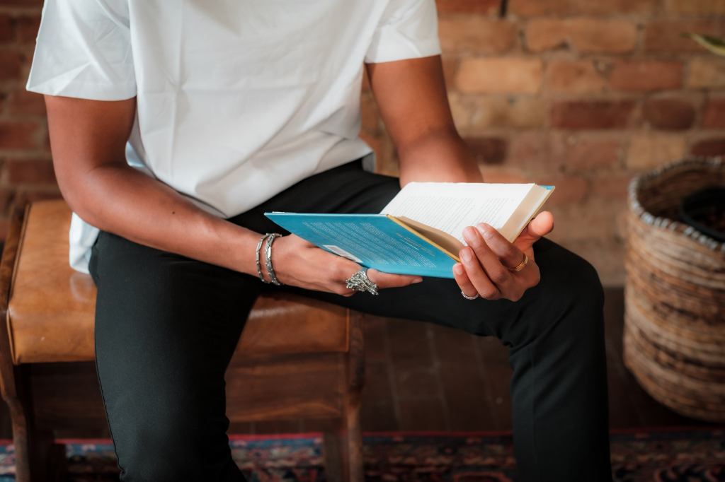 Image Description: A close-up photo of a person reading a blue book while sitting down. They have brown skin and are wearing black pants and a white top, along with rings and bracelets. On top of the photo is the word “Resources.”